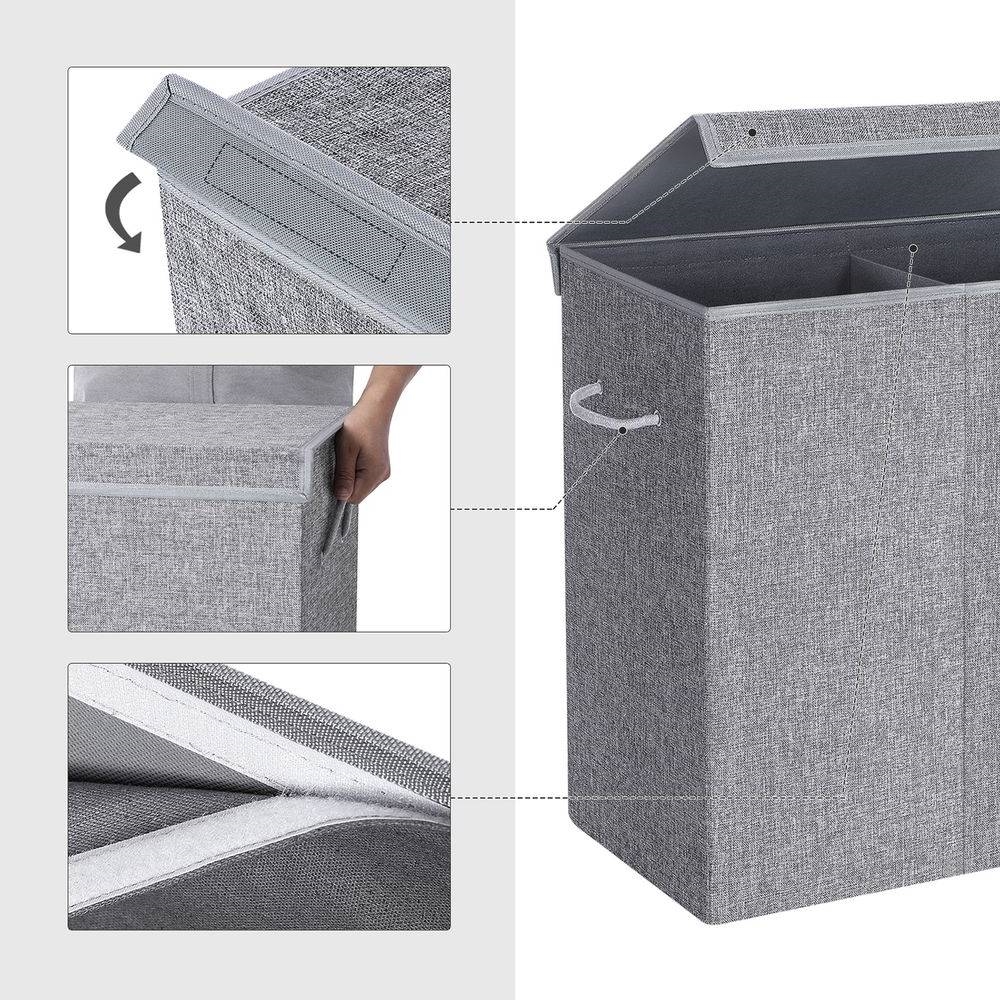 A good hamper plays an important role when it comes to laundering. Keeping your expectations in mind, we've put considerate thoughts into this Grey Fabric MDF 2-Compartmant Laundry Hamper Basket with Removeable Cotton Bag. Lid attached by magnetic strip and hook-and-loop fasteners, designed with extra width to keep in shape, is extremely easy and convenient to use. Removable and washable liner bag made of pure cotton, long-term durability is ensured, and you don't need to move the hamper at all. Gray fabric cover made of breathable linen material, easily matches all kinds of home decor. Extra MDF base board makes the hamper more durable and sturdier; you can also remove the base board and fold the hamper flat when not in use. Featuring stylish appearance and selected material, this laundry hamper is a great addition to any bedroom, laundry room or bathroom. Take it home and get organized!