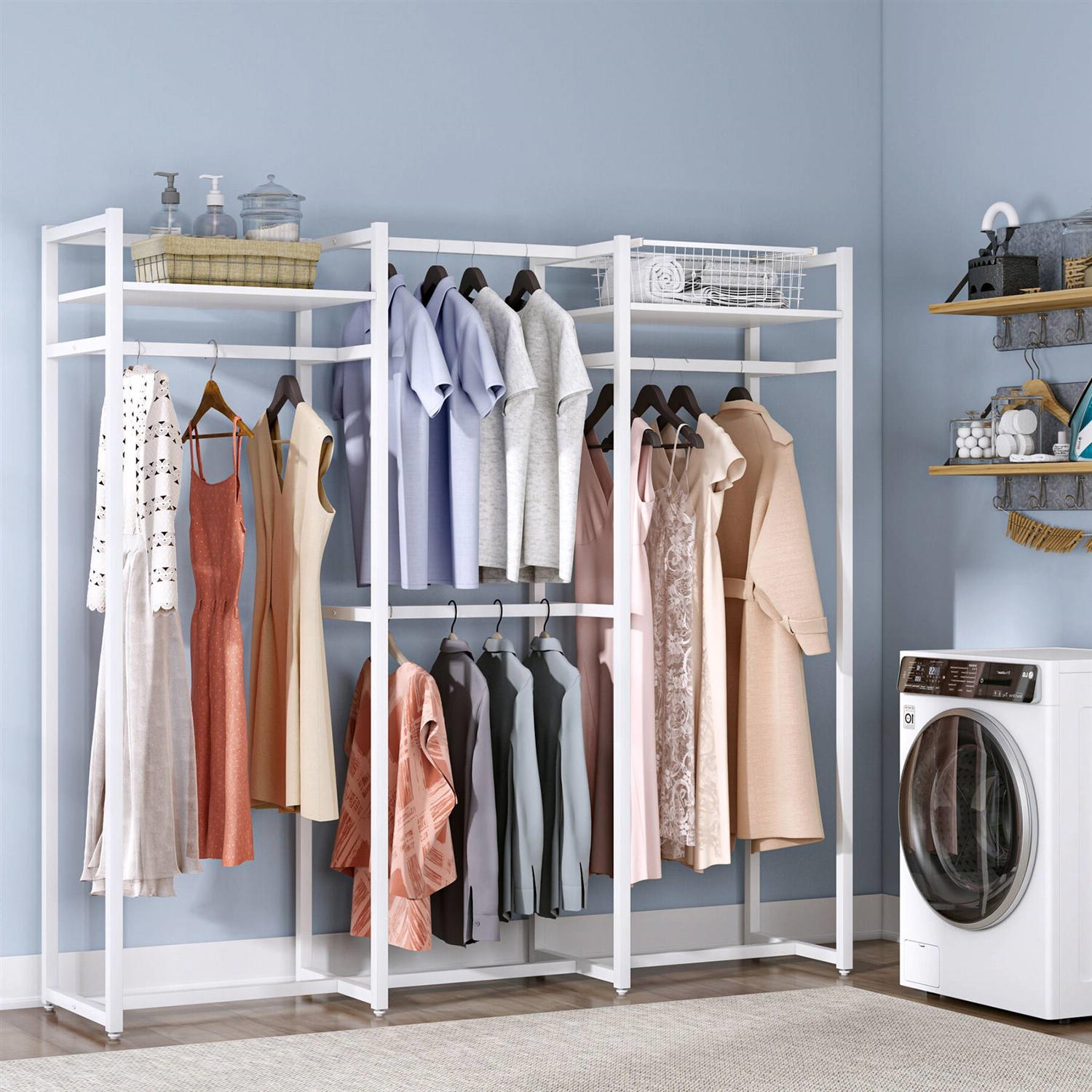 This Heavy Duty White Metal Freestanding Garment Rack with 4 Clothes Hanging Rods is perfect for clothes and shoes in cramped closets. Making small spaces more functional. The simple and chic design adds instant storage to any room. Easily transport your freestanding wardrobe. Sturdy and Durable- Heavy-duty metal frame combined with a rustic thick particle board makes it super stable and sturdy, with no wobble and collapse. Easy access to the bedroom, cloakroom, clothing store, laundry room, walk-in closet, and more. Large Storage Solution- 4 hanging rods accommodate both long and short garments. Every garment rod holds up to 50 lb. 2 open shelves ensuring you plenty of room to place clothes. And put large boxes of off-season clothes on the top for added storage.