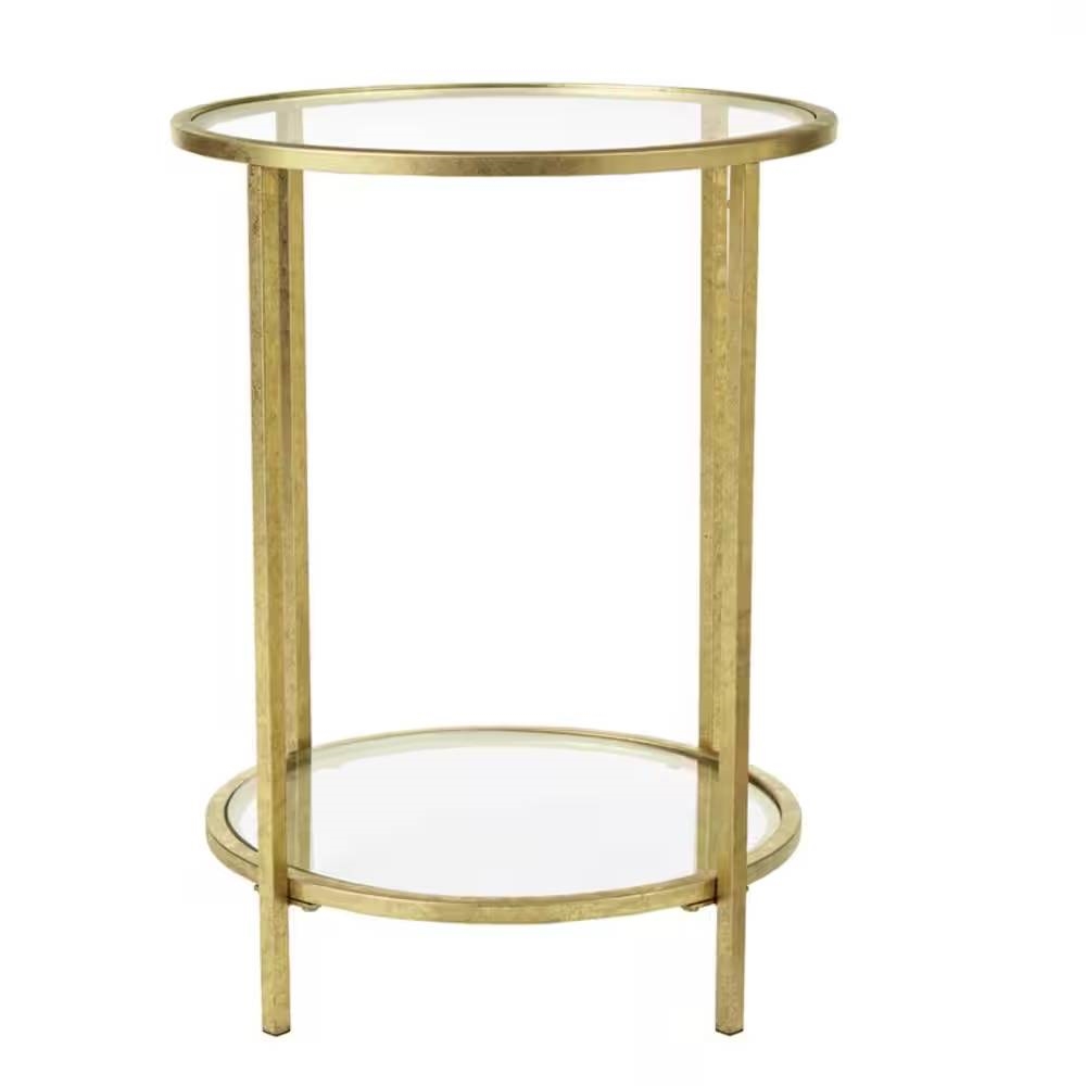 Round Accent Side Table Gold Metal Glass Top Bottom Shelf End Table