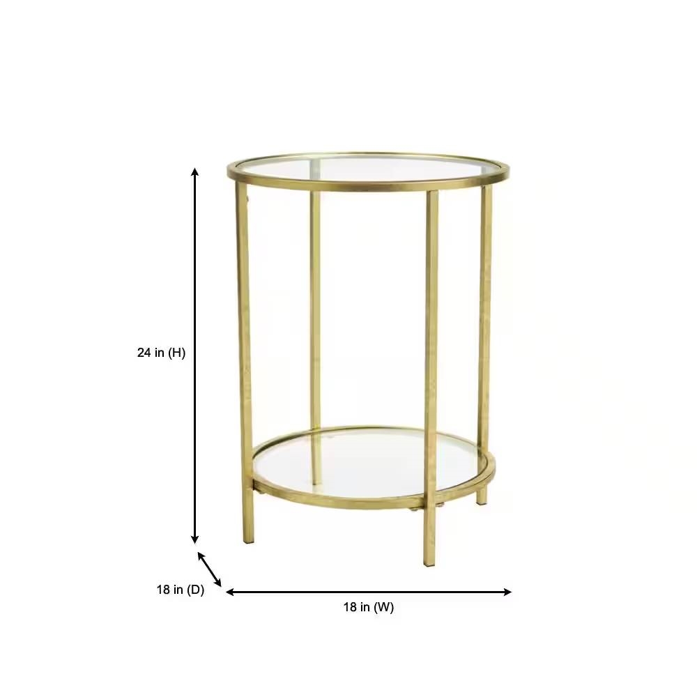 Our Round Accent Side Table Gold Metal Glass Top Bottom Shelf End Table is poised to steal the show in a living room or bedroom. Tempered glass forms the tabletop and lower shelf. A gold leaf finish lightens the side table's sleek round metal frame.