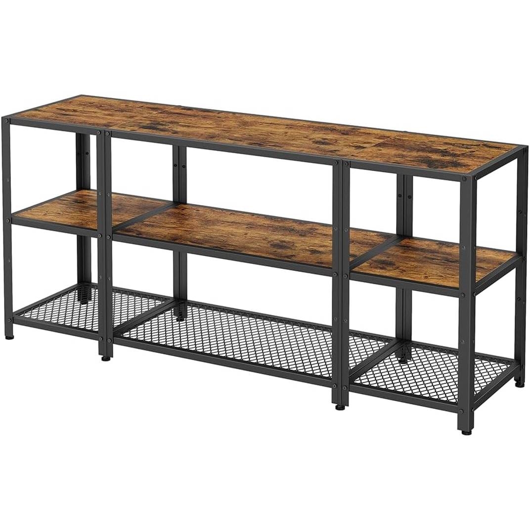 This Modern Metal Wood Industrial TV stand Entertainment Center for TV up to 65-inch with storage, measuring 57.9" L x 15.7" W x 25.6" H, holds TVs up to 65 inches and offers plenty of space for all your entertainment needs. Each middle shelf has 3 height options, enabling you to customize the storage space to accommodate items of different heights. Also, you may remove the shelves for bigger items. The open design of this TV cabinet makes it easier to access and organize your gaming consoles, speakers, and remote controls. Also, it provides better ventilation to prevent overheating of your electronics. The sturdy steel frame with reinforced connections offers a solid structure for this TV console. Premium particleboard panels are water-resistant for easy cleaning and scratch-resistant for lasting use. Steel legs come with plastic adjustable feet to keep the entertainment center balanced even on slightly uneven floors and protect your floor from scratches.