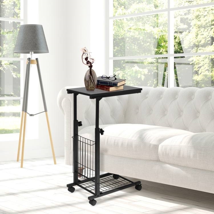 This Black Multipurpose Adjustable Height TV Tray Sofa End Side Table on Wheels can be used as an end table, wheeled computer tray, lamp table, TV tray, etc. Made from 15mm chipboard and sturdy steel frame, the frame with an open, cantilevered design, load capacity up to 55lbs. Compact size, space-saving and light-weight design, this simple stylish side table is functional and suitable for any decor of your room, perfect combination with other furniture accessory. Slides under sofas with ease! Comes with rolling casters ,this snack table easy to slip under sofas, you can reach the items on top without standing, great on both carpet & wooden floors and prevents scratches. Lower steel mesh provided extra storage space for books, magazines , etc.