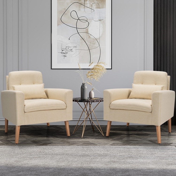 Relax in style and comfort with this Mid-Century Modern Style Linen Living Room Accent Chair w/ Pillow - Beige Has a wide seat and comfortable backrest. Breathable soft to touch linen fabric filled with a soft sponge and spring cushion makes relaxing easy. Made of durable pine and holds up to 330 lbs.