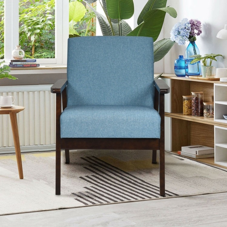 Sit back and relax in this Retro Linen Wide Accent Chair w/ Espresso Rubber Wood Frame - Blue. Ergonomic armrest is designed for relaxing your arm and hands. Wide back design can support your spine nicely and distribute pressure evenly when you lean on it and the chair is equipped with antiskid foot pads to prevent the floor from being scratched. Made of natural rubber wood frame, this accent chair is firm and wear-resistant for long service time. It has no burr and no smell for safe use. Thanks to premium material and sturdy structure, it can withstand up to 330 lbs. without wobbling. The seat and back are filled with high-density sponge, which is soft enough for you to enjoy yourself and relax your body after tired work. Besides, fine linen cover features gentle texture and friendly touch, providing you with extra comfortable feeling.