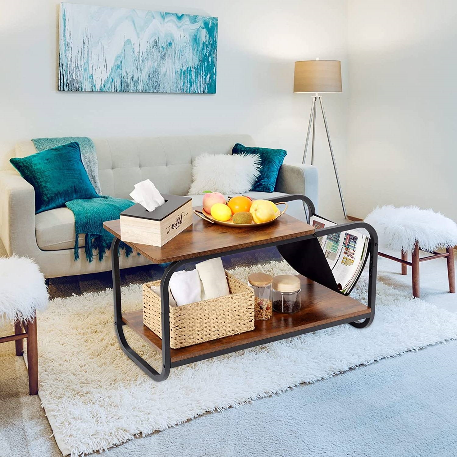 • This coffee table is double-decker and provides plenty of space for remotes, storage bins, handicrafts and other items. And the durable fabric sling pocket provides you exclusive space to store your magazines, handy books, and newspaper. It saves space and helps keep your room neat.