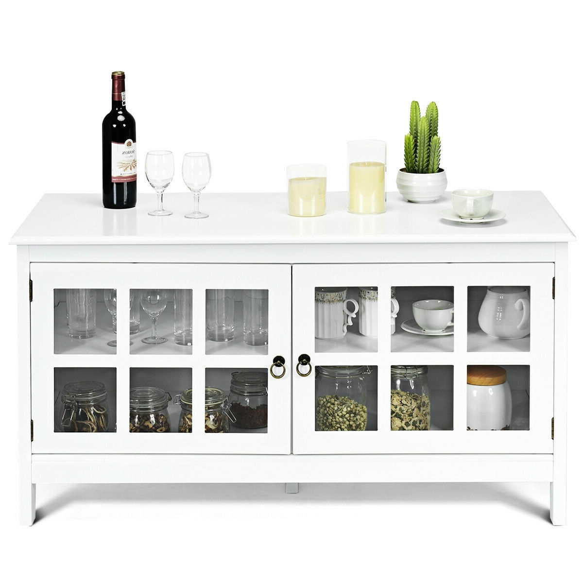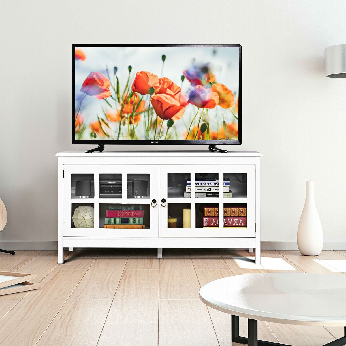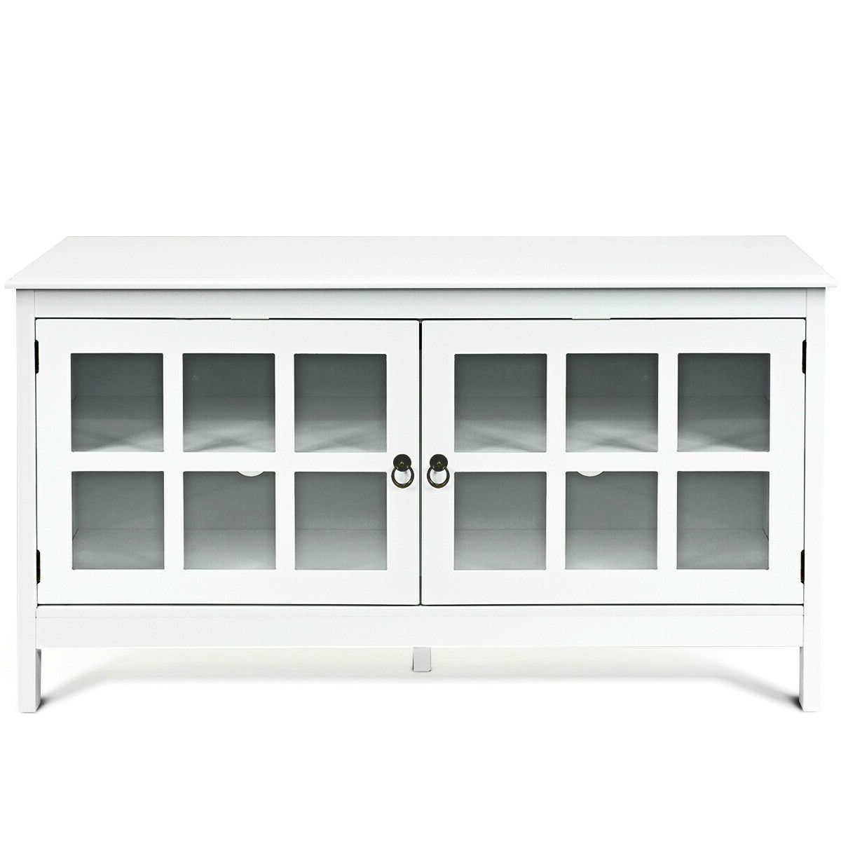 White Wood Entertainment Center TV Stand with Glass Panel Doors