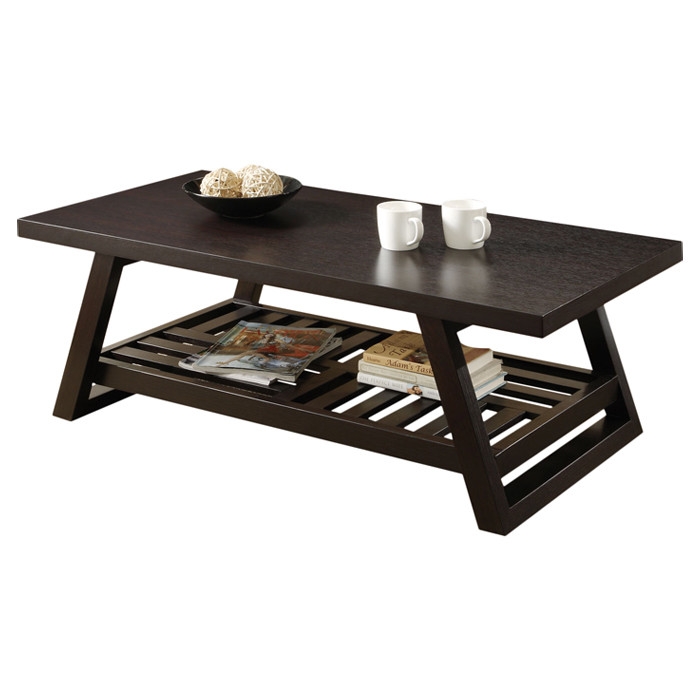 Contemporary Coffee Table with Slatted Bottom Shelf in Rich Brown Contemporary Coffee Table with Slatted Bottom Shelf in Rich Brown