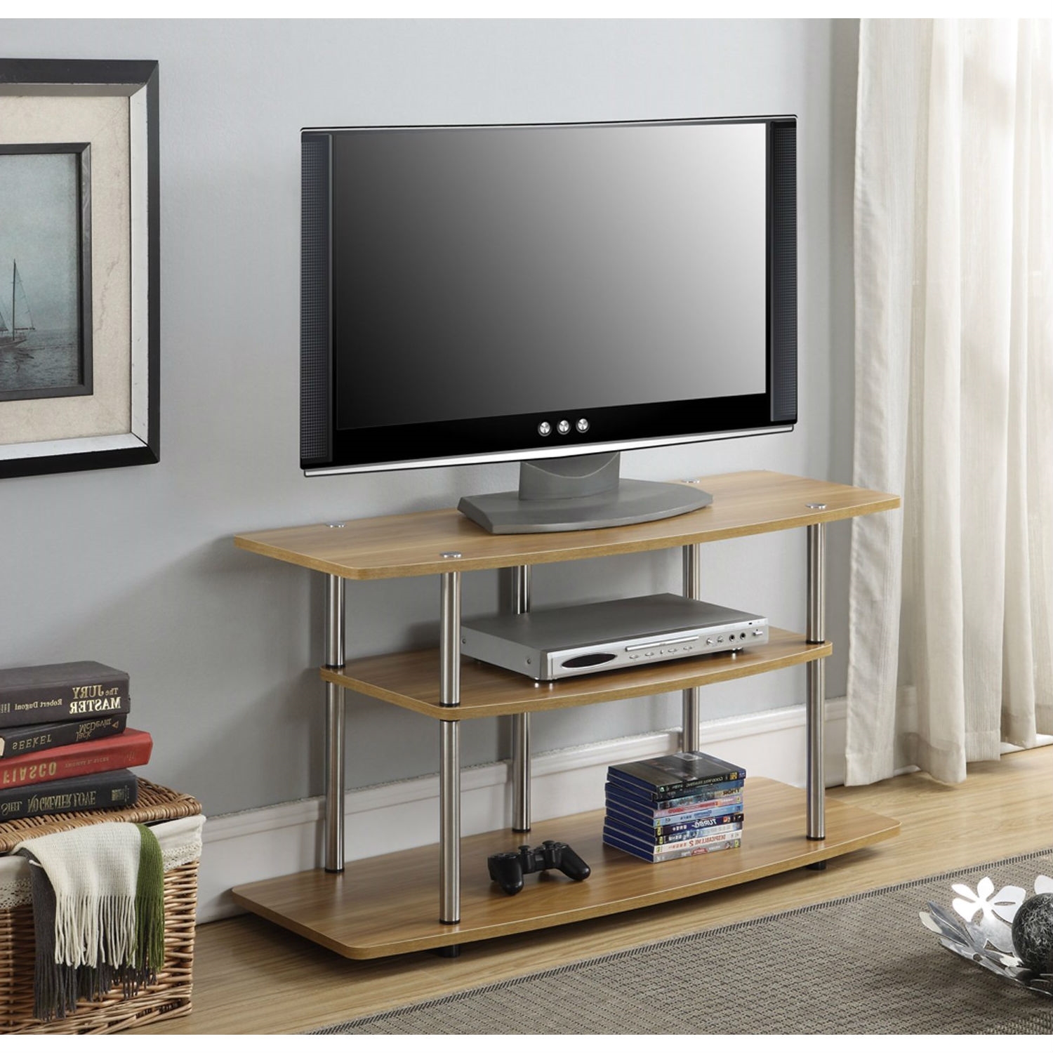 This Modern Wood Metal TV Stand Entertainment Center in Light Oak Finish is the perfect complement to any living room décor. Featuring an open modern design that allows for easy cable management. Also Featuring three spacious shelves that will give you plenty of room for all of your media components. Maximum TV Size 42 Inches. Maximum TV Weight 85 Pounds.
